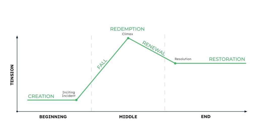 Whether it’s Benny the Jet’s journey to get the Babe Ruth baseball back, Frodo’s journey to destroy the One Ring in Mordor, or Shrek’s hero journey to reclaim his swamp, the storyline arc can be seen. It’s found in every good story—including the greatest story ever written: God’s.
