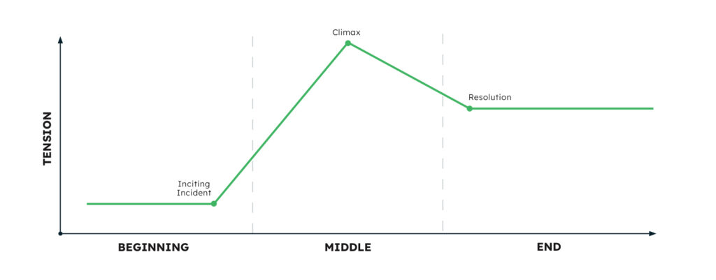 Act I of a storyline always starts with context. This is where the world is created and the author establishes what is normal. Then an inciting incident disrupts that normality, creating Act II: the rising tension. In this act is where tension rises and conflict builds. Eventually, the story reaches Act III: the climax—a decisive moment where the protagonist triumphs. The fourth Act is the falling tension as the consequences of the climax fall into place, until the story reaches its fifth and final act: the resolution. This is where everything is set right and a new normal is established.
